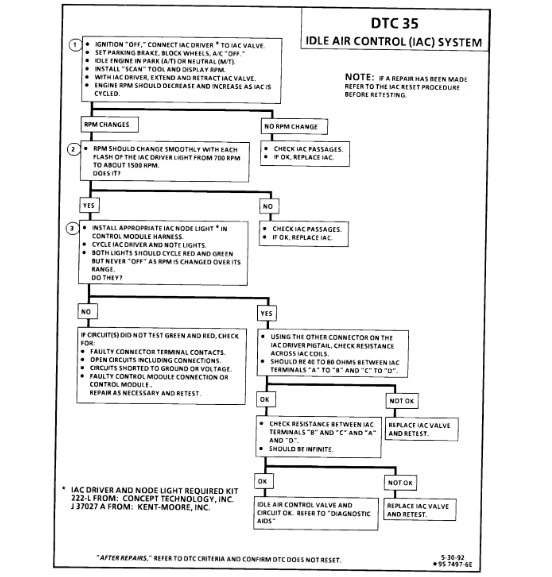A slow, unstable, or fast idle may be caused by a non-IAC system problem that cannot be overcome by the IAC valve. Out of control range IAC Tech 1 "Scan" tool counts will be above 60 if idle is too low, and zero counts if idle is too high. The following checks should be made to repair a non-IAC system problem.