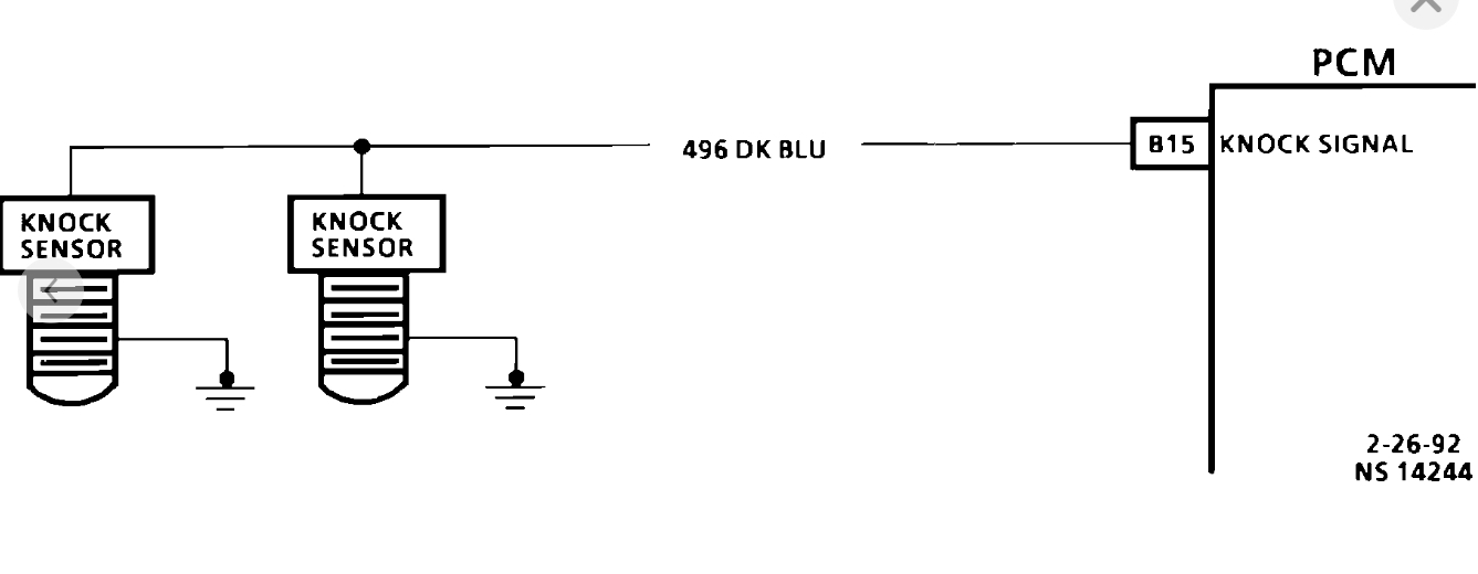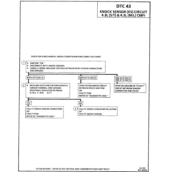 The DTC 43 circuit consists of two knock sensors with one wire that is spliced together and goes directly to the PCM. There are two DTC 43 cheeks performed by the PCM. One check consists on monitoring CKT 496 for a voltage that is above 0.63 volts and below 3.0 volts.