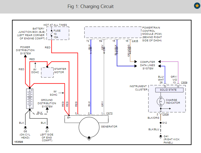 Okay, in the diagrams down below I have included the wiring diagrams of the starting and charging system of the diagrams down below. I have also included a diagram and callout of the Battery Junction Box. If you could please check fuse #8(30A) of the Battery Junction Box. Here is a link below for how to check a fuse, if needed: