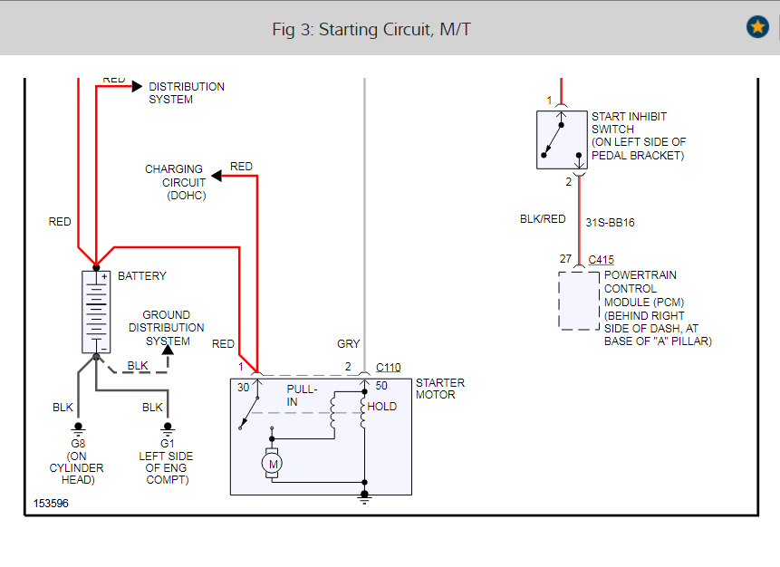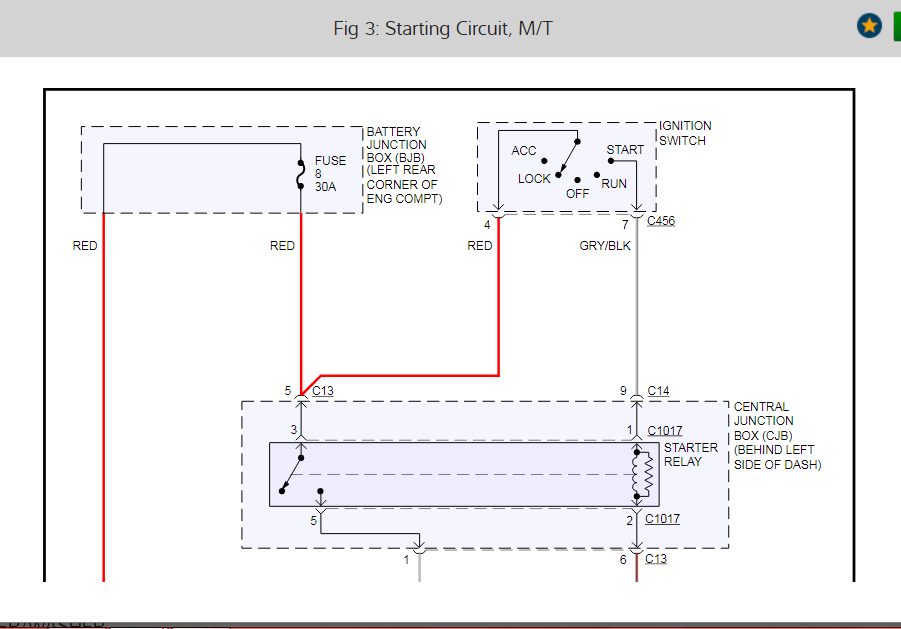 Okay, so where are we. Okay, so we are not sure on fuse 8. Okay, let's start over. In the diagrams down below I have included a wiring diagram of your vehicle's starting circuit. This is going to be what we are going to be working off of, so we are on the same sheet of music, so to speak, and we both have a common point of reference. Don't worry about reading it, that's what I am here for. I will explain what needs to be tested and why we are testing it. This is going to be a systematic process of elimination that will lead to the problem, so please, one thing at a time. Okay, look at the wiring diagram and locate the battery in the lower left hand side of the diagram and get back to us when you have got it, please.