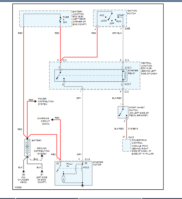 Sorry for taking so long to get to you. I've been preoccupied dealing with a personal matter, and I apologize. Okay, so you've identified the battery on the wiring diagram. Next follow the red wire all the way to the left coming from the battery going towards the top of the page to a perforated box. On the right hand side of the perforated box it says Battery Junction Box [BJB] and then gives it's description in your vehicle. This represents a red wire coming from the positive battery terminal go to the Battery Junction Box [Fuse Box] in your vehicles engine compartment. In the perforated box is a representation of the wire continuing and then it goes to Fuse 8 in the BJB. Please check fuse 8 in your BJB. This is the next component the battery voltage must pass through to make it to your vehicle's starter. Here is a link below to a guide explaining how to test a fuse: