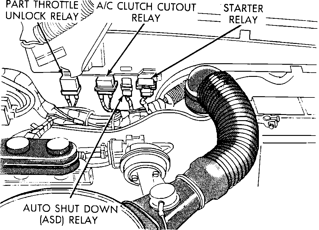The first thing I would check is the auto shut down relay (ASD). The Auto Shutdown relay is located in the engine compartment on the left hand fender. See picture 1.