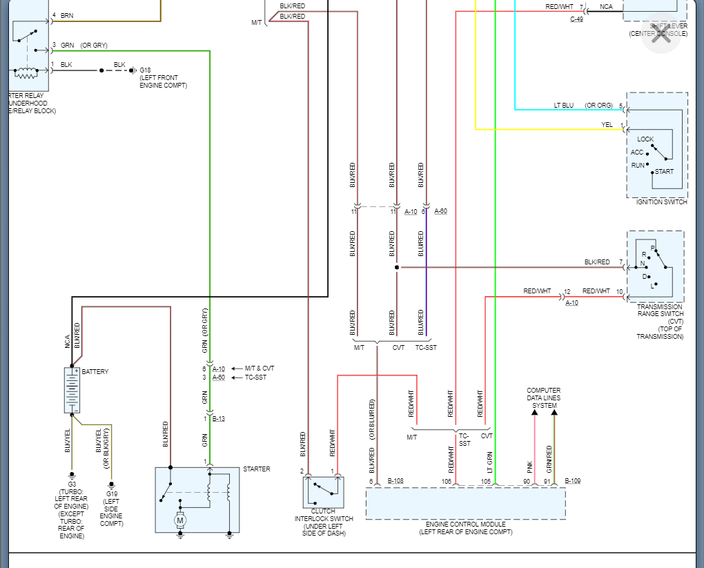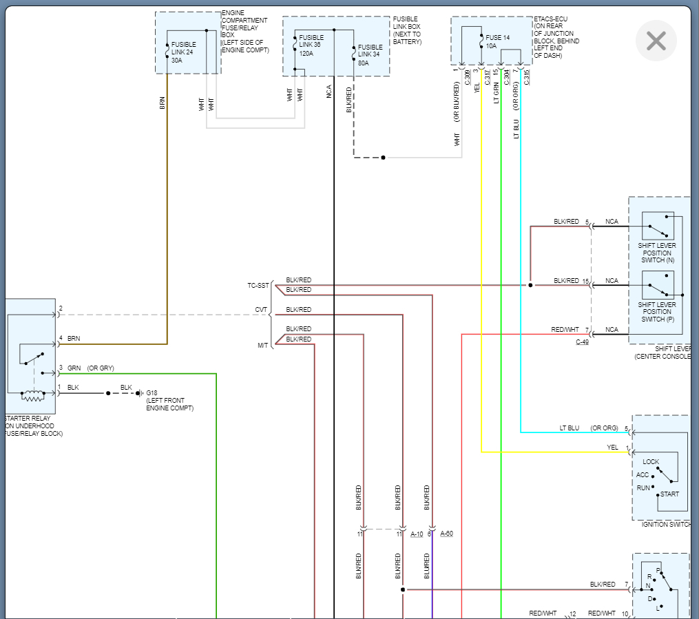 I attached the wiring diagrams below that will help with this testing. However, if you have no voltage then we need check the relay and the transmission range sensor. Basically, if the ECM doesn't know the vehicle is in park, then it will not start the engine.