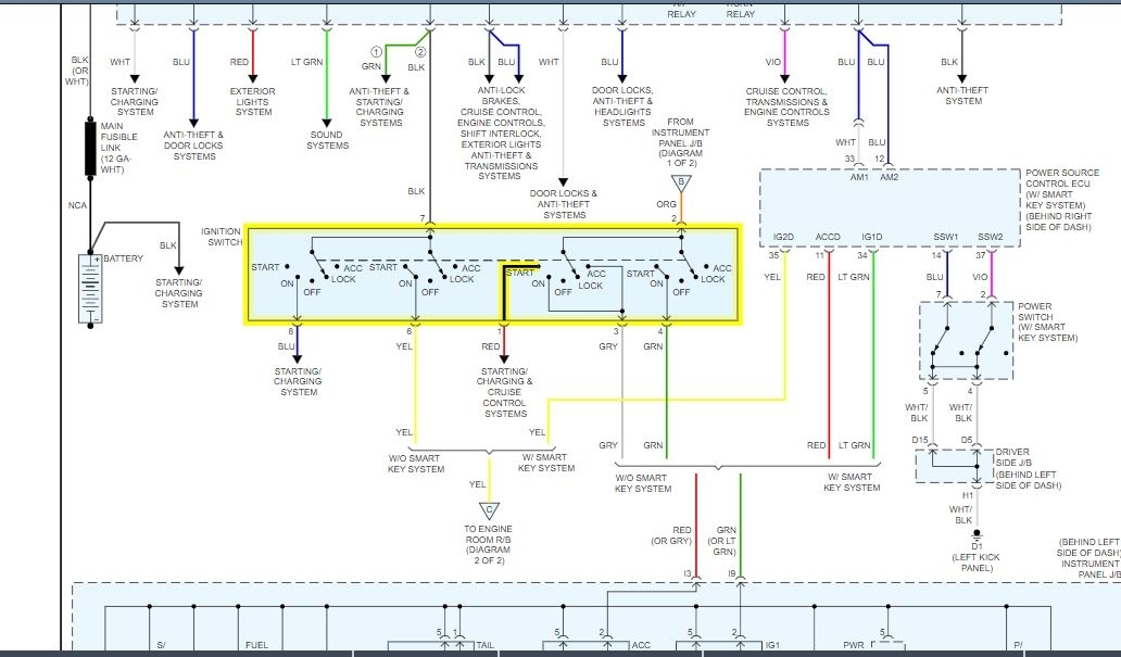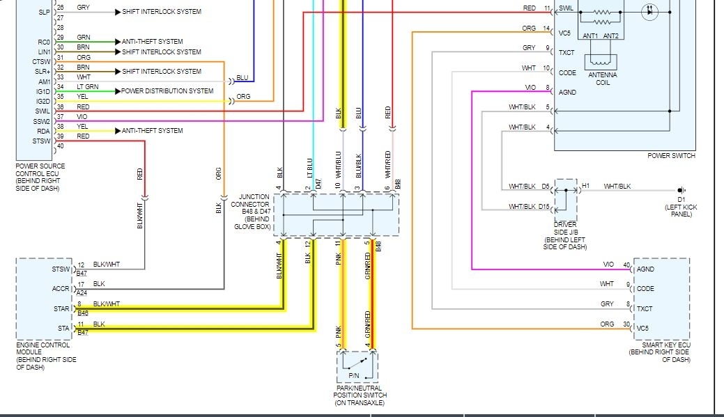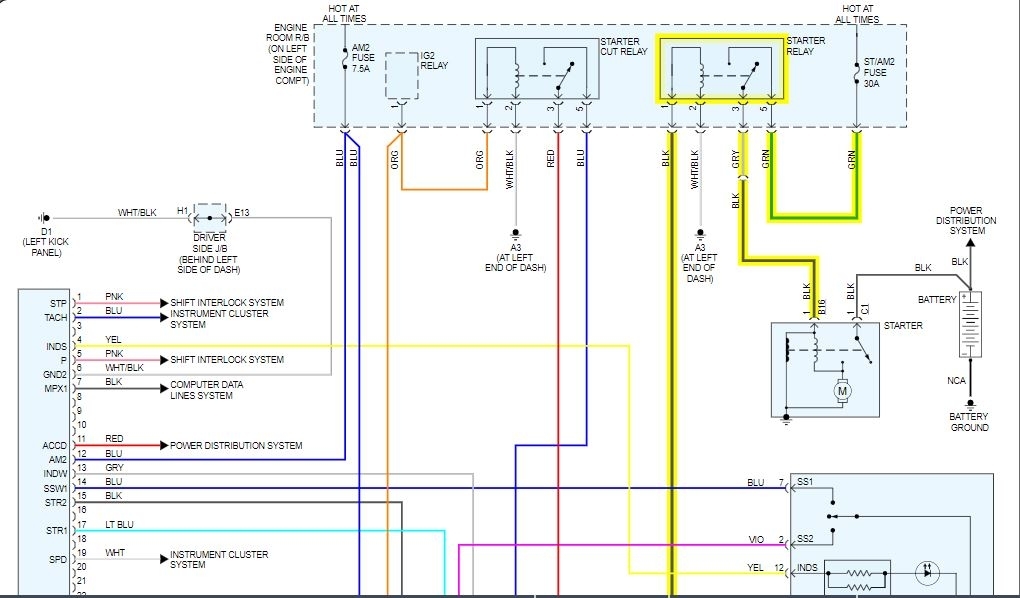 When you push the start button, it sends a signal to the ECM. The ECM looks for a signal from the park/neutral switch and when it is right, it will energize the relay and send power to the starter solenoid.